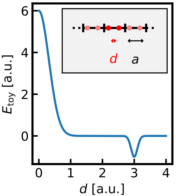 The previous example used a simple 2D bimodal energy surface. Let’s now introduce a toy model that’s a bit closer to real-world materials simulations. We consider a periodic chain of particles interacting via the pair potential shown below: